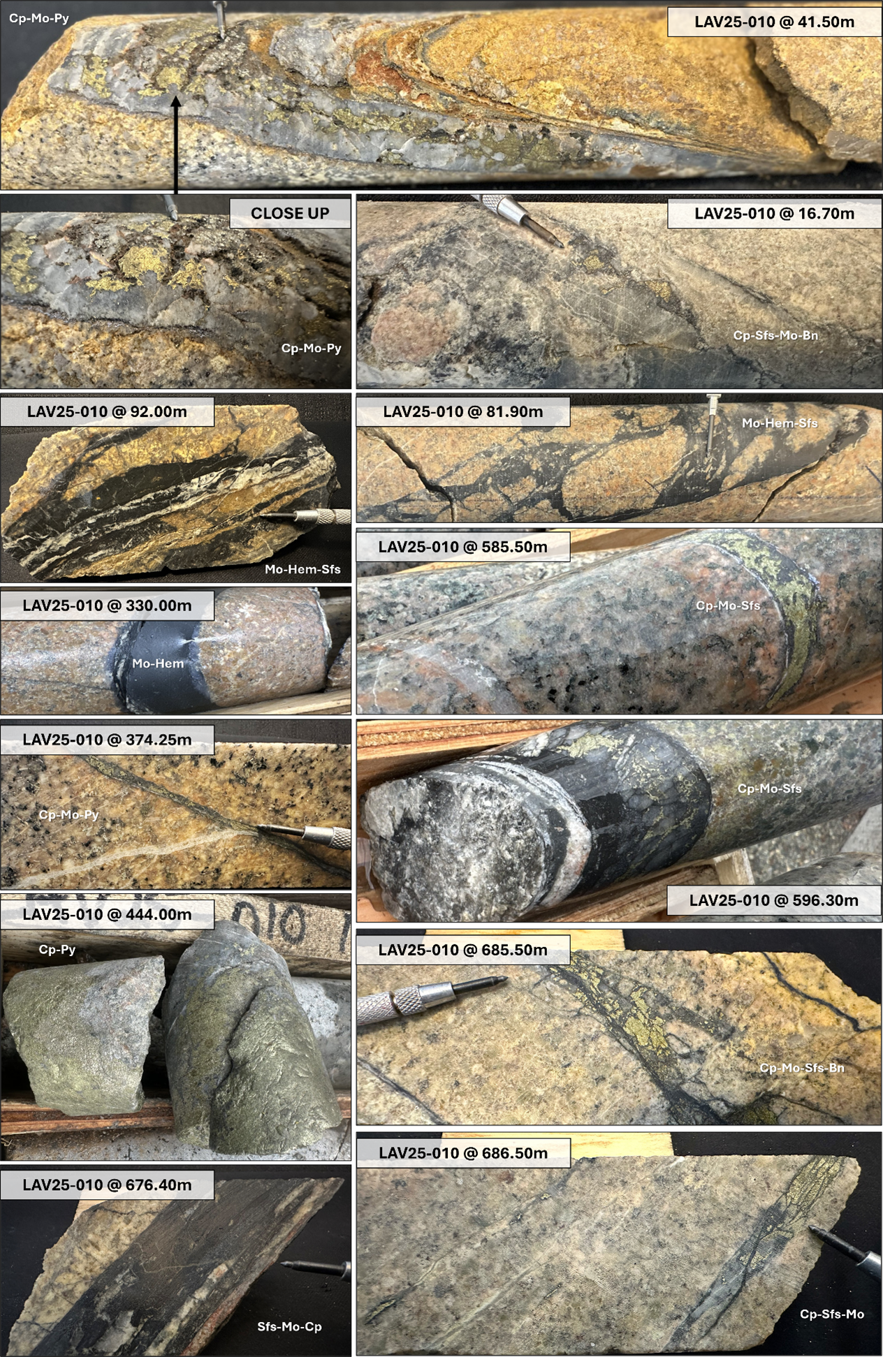 - Alteration and mineralization styles observed throughout hole LAV25-011 show zonation patterns from Mo-Ag dominant in upper levels to locally intensely Cu-Mo-Ag-rich below 350 metres and are interpreted to represent increasing proximity to a copper-molybdenum-silver–rich ore body that remains open laterally and at depth.