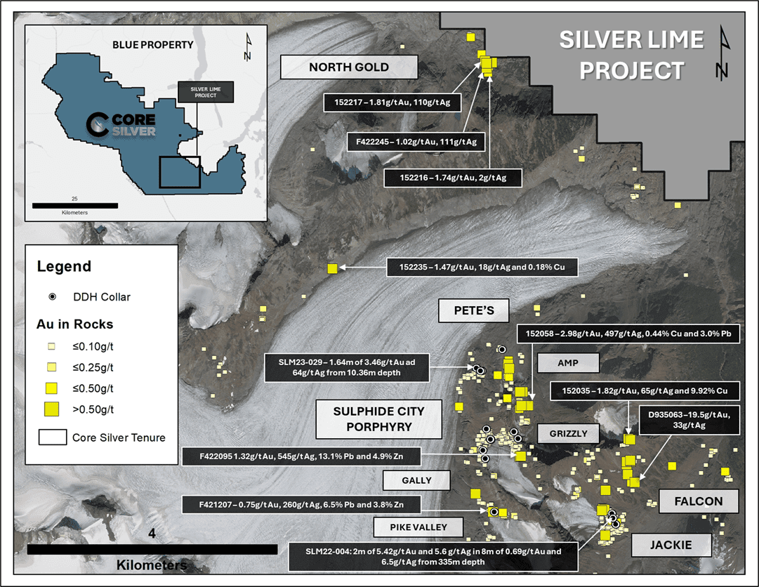 Vancouver, British Columbia – November 3, 2025 – Core Silver Corp. (“Core Silver” or the “Company”) (CSE:CC) (FSE:8ZR) (OTCQB:CCOOF) is pleased to summarize widespread gold results and their associated silver values from the Silver Lime Polymetallic Project (“Silver Lime” or the “Project”), located within the Company’s 100%-owned Blue Property (the “Property”) in the Atlin Mining District of northwestern British Columbia.